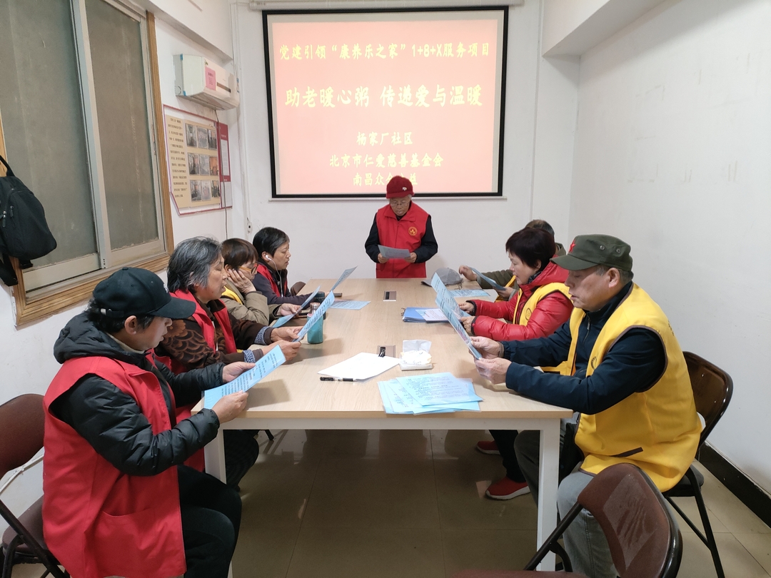 为更好地充实“康养乐”之家——1+8+X多元化服务内容,切实利益到辖区居民,杨家厂社区积极链接社会公益资源,开展助老志愿服务。杨家厂社区携手北京市仁爱慈善基金会,委托南昌众合公益志愿服务队于每月第三个星期四下午开展针对独居老人的入户“助老-奉粥”、免费理发等系列活动,为老人们带来温暖与关爱。