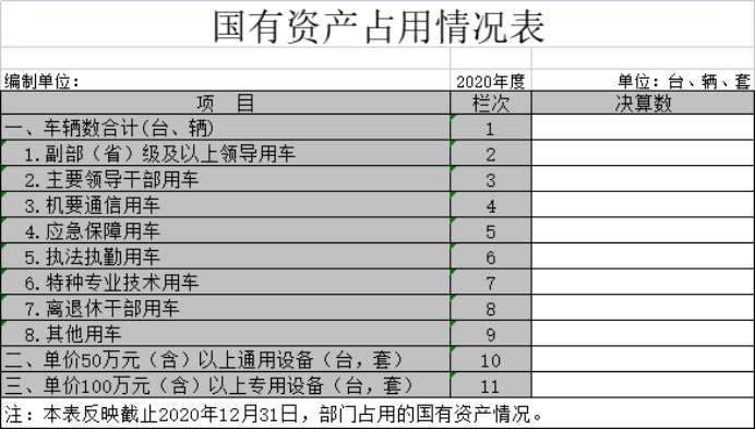截止2020年12月31日,本部门国有资产占用情况见公开10表《国有资产占用情况表》。本部门共有车辆 0 辆,其中,副部(省)级及以上领导用车 0辆、主要领导干部用车0 辆、机要通信用车 0 辆、应急保障用车 0 辆、执法执勤用车 0辆、特种专业技术用车0 辆、其他用车0 辆,其他用车主要是公务用车改革,无支出;单位价值50万元以上通用设备0 台(套);单位价值100万元以上专用设备 0 台(套)。