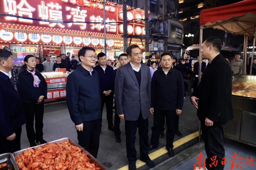 珠宝街毗邻南昌八一起义纪念馆、万寿宫历史文化街区,这里古韵悠悠,充满烟火气,汇聚了江西特产、南昌小吃,从早到晚人潮涌动,已成为外地游客来南昌游玩的热门“打卡点”。在珠宝街,李红军走进群众当中,与大家面对面交流,征求大家对夜市打造的意见建议,向外地游客推介南昌。李红军说,近年来,南昌坚持高质量发展夜间经济,积极打造夜间吃喝玩乐游购娱新业态新场景,诚挚欢迎大家多来南昌看看,领略南昌“一江两岸”夜色,欣赏八一广场、滕王阁、万寿宫历史文化街区夜景,品尝南昌各类特色小吃。南昌将全力打造良好的旅游环境、消费环境,让大家在南昌玩得开心、舒心。位于朝阳新城的绿滋肴不夜城是集网红餐饮、娱乐体验、品质酒店三位一体的夜间潮流街区,目前街区综合招商率已达80%。调研中,李红军详细听取街区运营管理情况及招商引资工作,实地走访部分入驻商户,了解大家的发展情况。李红军指出,夜市经济发展离不开良好的营商环境。近年来,我市规划打造了一批各具特色的夜市街区,吸引了众多品牌商户入驻。这些企业,为满足市民对美好生活的向往提供了优质服务,为助力南昌经济社会发展作出了积极贡献,各地各部门一定要用心用情用力帮助企业解决实际困难,切实让企业进得来、留得住、发展好。