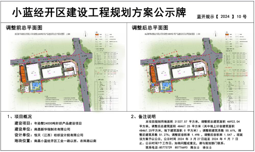 本项目规划用地面积 31327.57平方米,调整前总建筑面积46922.04平方米,调整后总建筑面积48467.25平方米(其中地上计容建筑面积48467.25平方米,地下建筑面积0平方米);调整前建筑系数50.61%,调整后建筑系数 51.27%;调整前容积率1.498,调整后容积率1.547。现就该方案予以公示,公示时间2024年3月27日起至2024年4月7日止。公示时间7个工作日。如有问题或意见,请与规划部门联系。