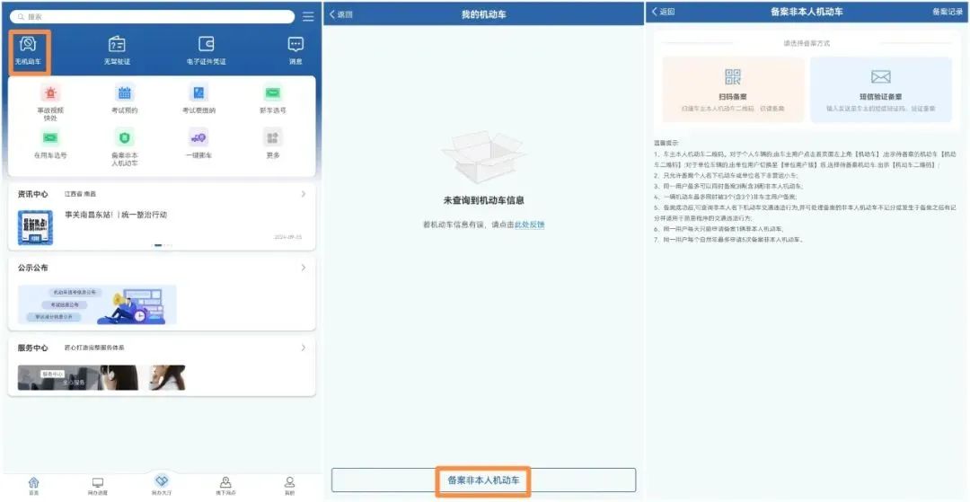 打开“交管12123”APP,点击【更多】,找到机动车业务中的【备案非本人机动车】,进入备案非本人机动车业务流程,用户可以选择【扫码备案】或【短信验证备案】两种方式备案非本人机动车。